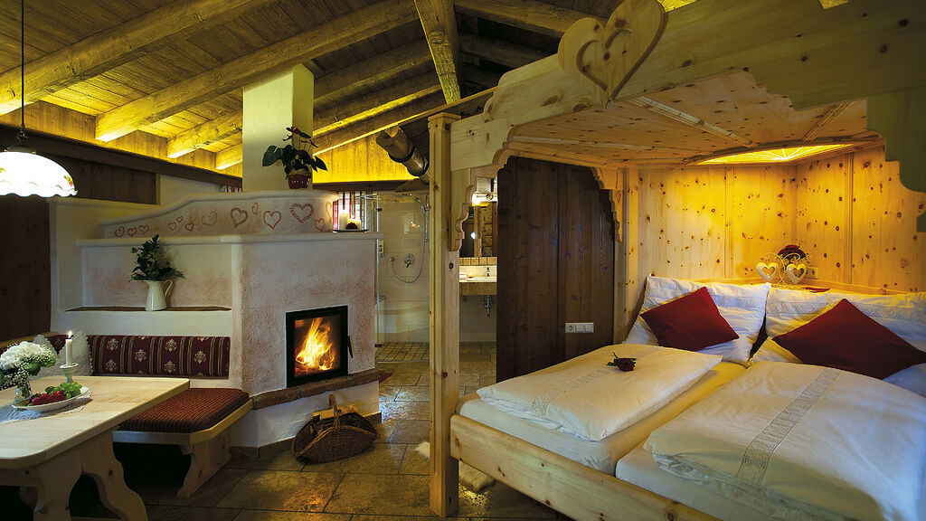 chalet 2 - Kuschelhütte Diana - komfortní pokoj s manželskou postelí a kuchyňským koutem, sociální zařízení se sprchou a vířivou vanou (oddělené WC), kachlová kamna, terasa, privátní sauna