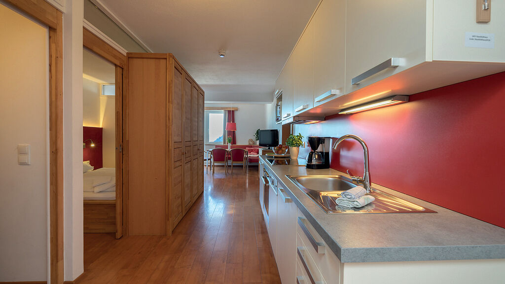 bilo 4 - 45 m² - 1 kabina s manželskou postelí, obývací pokoj s kuchyňským koutem a rozkládacím gaučem pro 2 osoby, sociální zařízení se sprchou či vanou, oddělené WC, balkon v rámci společné terasy s apartmánem mono 4