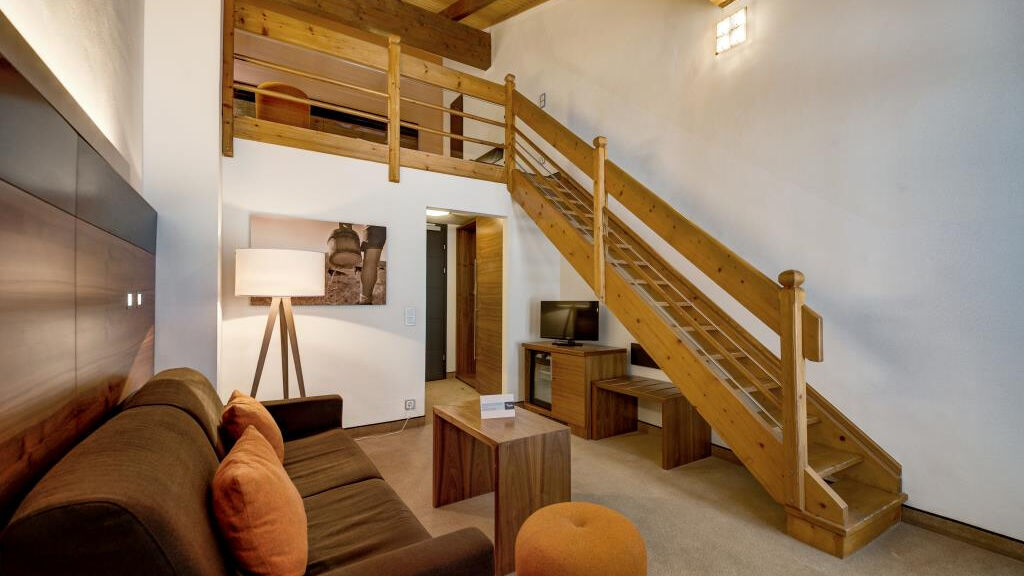 Rodinné pokoje "Mitanander" (A2D/A3D/A4D): pro 2–4 osoby, cca 35 m2, obývací ložnice s rozkládací pohovkou pro 2 osoby a vyvýšená úroveň s dvoulůžkovou postelí.