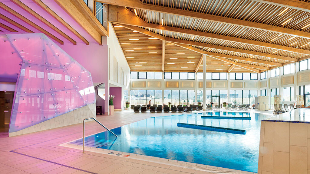 lázně o velikosti 6.700 m² - bazén 1000 m² s lehátky propojený s venkovním vyhřívaným bazénem, finská sauna, biosauna, ledová lázeň, pára, infrakabina, relaxační koutek s lehátky, masáže*, kosmetické služby*, posilovna