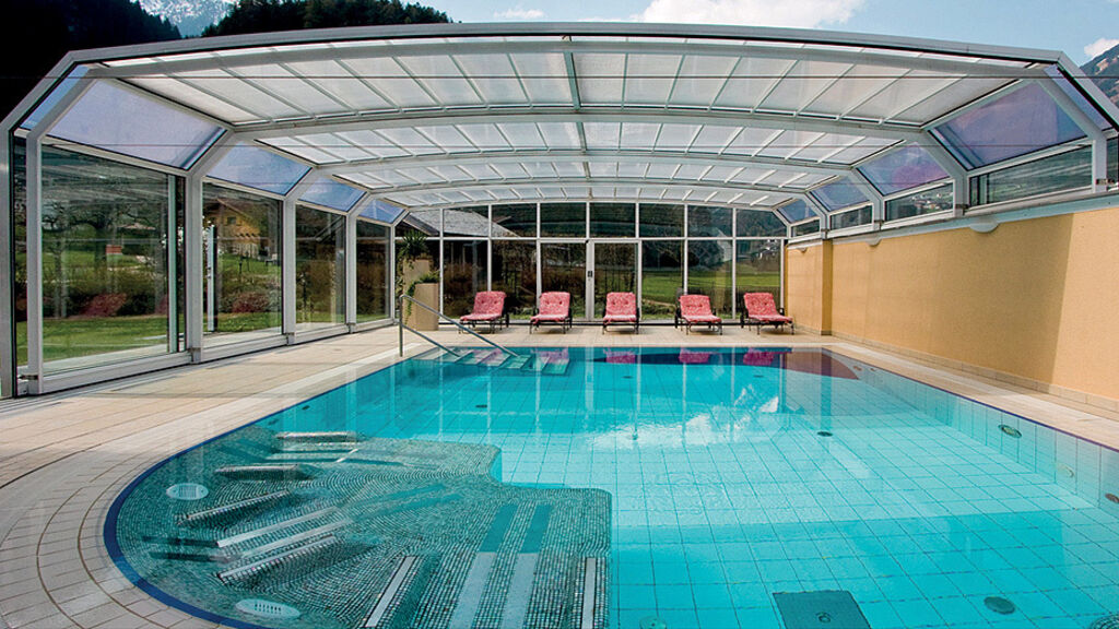 bazén 100 m² propojený s venkovním vyhřívaným bazénem, sauna, finská sauna, pára, horizontální solárium*, relaxační místnost s lehátky, masáže*, kosmetické služby*; posilovna