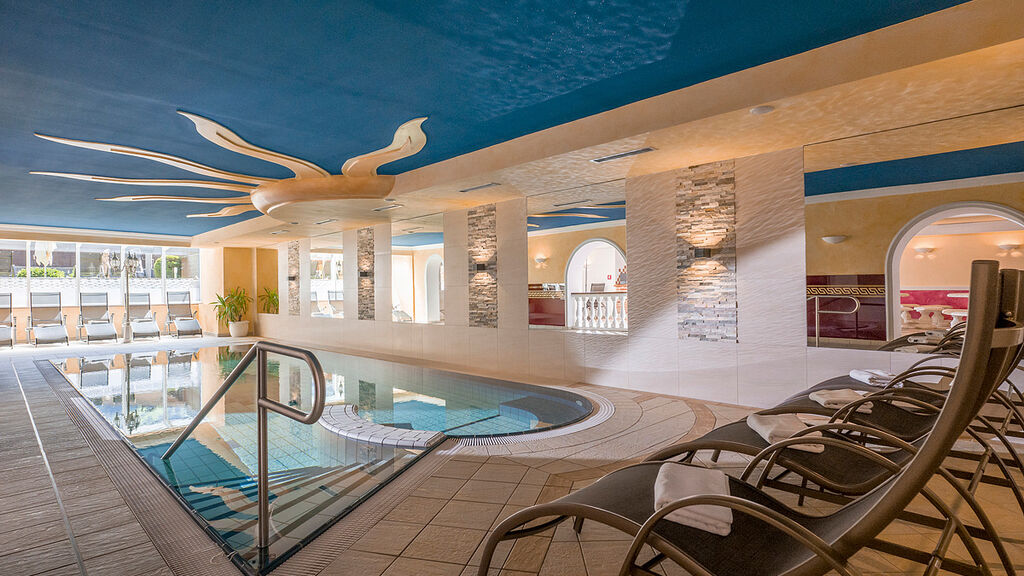 bazén 48 m² s vířivkou*, sauna, finská sauna, bio sauna, pára, infrakabina, horizontální solárium*, relaxační koutek s lehátky, posilovna, masáže*; děti mají do wellness přístup pouze v doprodu dospělé osoby
